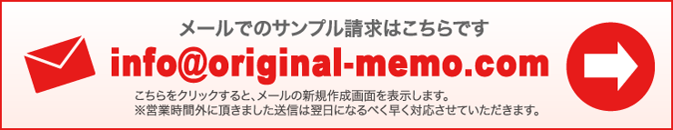 オリジナルメモ帳のノベルティ、グッズ製作などのことならメモ帳王国に! くるみメモ、片くるみメモ、一筆箋、クロス巻メモ、デスクメモ、ポップアップメモなど。 オリジナル印刷(名入れ印刷)を激安価格にて!全国送料無料、デザイン制作費無料! 製本は安心の国内自社工場(社内一貫生産)にて対応しております。 受注から納品までかかわっているのでまかせて安心!品質には自信があります!
